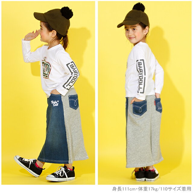 バックにスリット入り&ストレッチが効いたデニム素材で動きやすい! 大人サイズとおそろいコーデを楽しんで♪