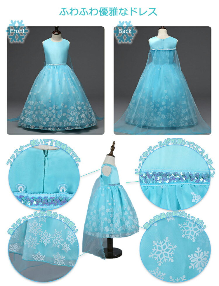 商品名 【送料無料】プリンセス ドレス 子供ドレス ワンピース キッズ コスプレ コスチューム プレゼント 人気 ギフトアナ雪(アナと雪の女王)のエルサ風 ドレス 衣装 子供 雪 雪の結晶 ブルー 青 水色 110 120 130 140 150 なりきりドレス 冬 記念日 写真撮影 雪の妖精 マント